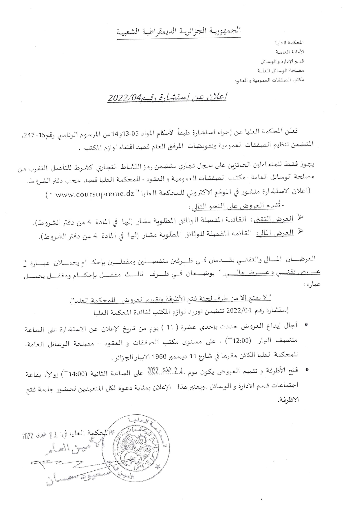 > تعلن المحكمة العليا عن إجراء استشارة رقم 04/ 2022 قصد إقتناء لوازم مكتب