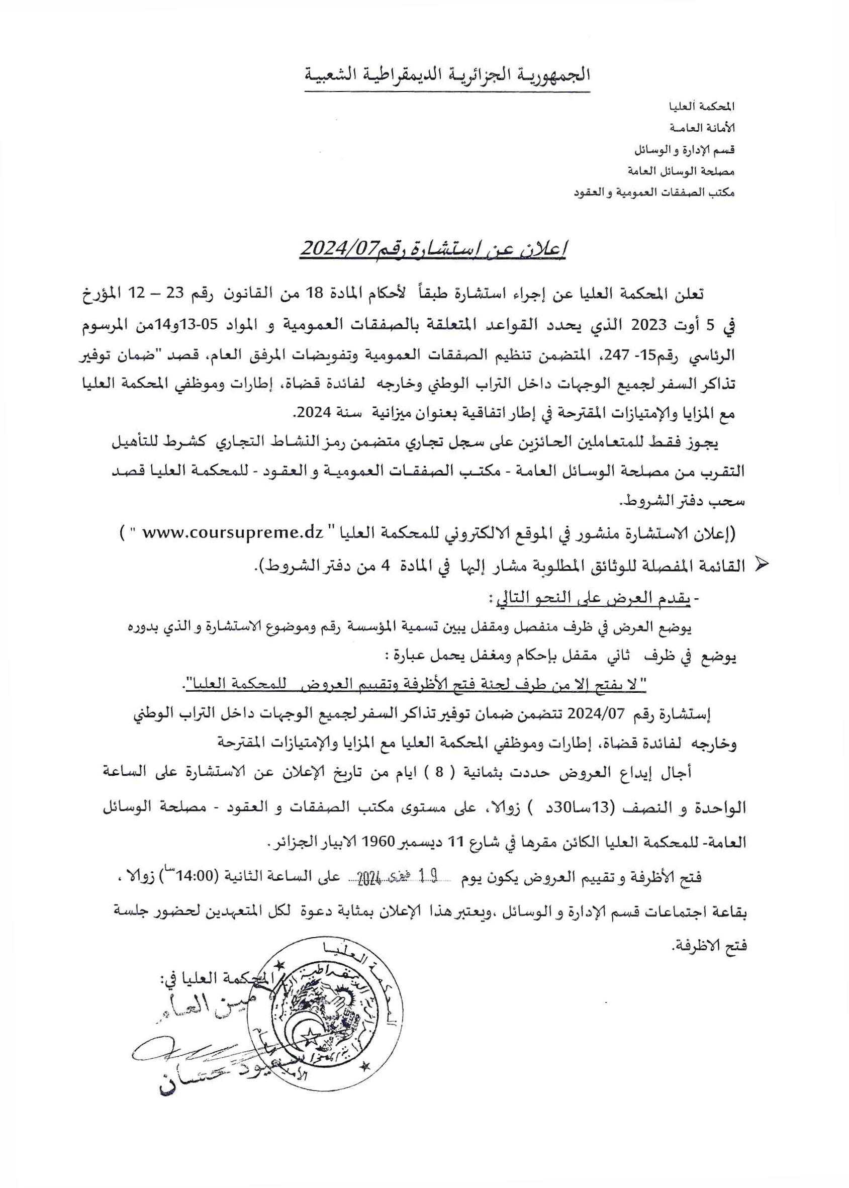 تعلن المحكمة العليـا عن إجراء إستشارة رقم 2024/07 قصد ضمان توفير تذاكر السفرلجميع الوجهات داخل التراب الوطني وخارجه لفائدة قضاة وإطارات وموظفي المحكمة العليا