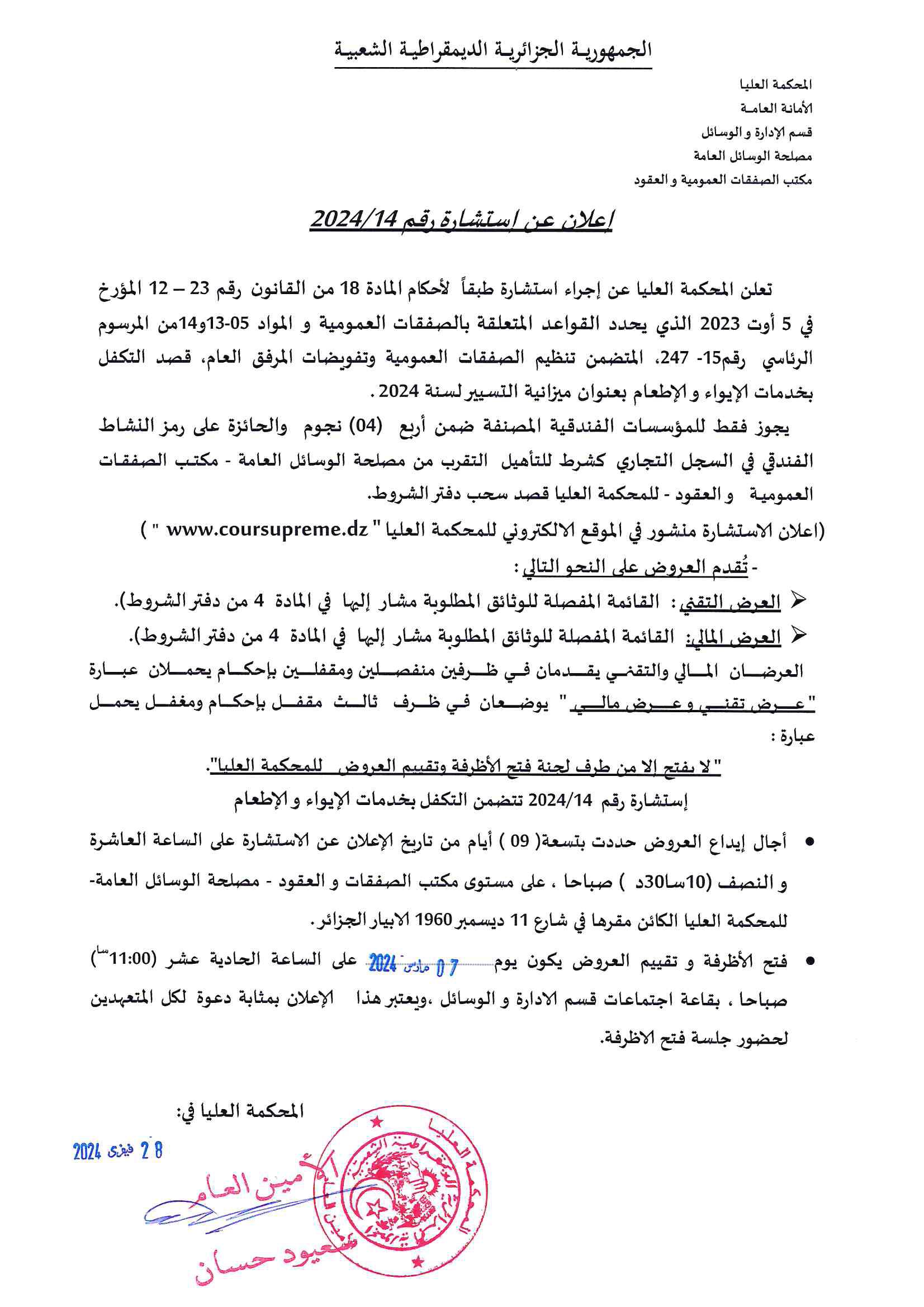 تعلن المحكمة العليـا عن إجراء إستشارة رقم 2024/14 قصد التكفل بخدمات الإيواء و الإطعام