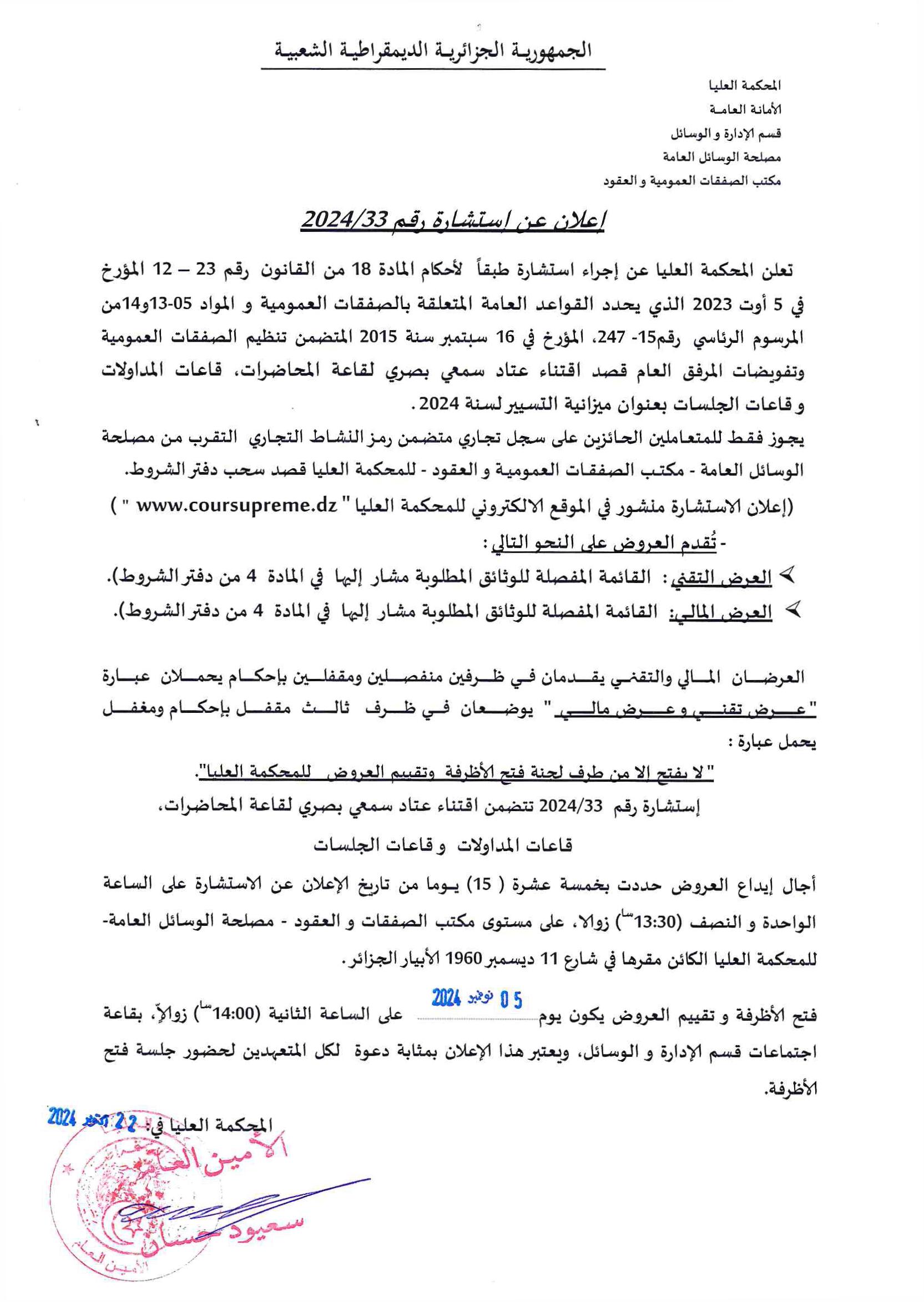 تعلن المحكمة العليـا عن إجراء إستشارة رقم 2024/33 قصد اقتناء عتاد سمعي بصري لقاعة المحاضرات