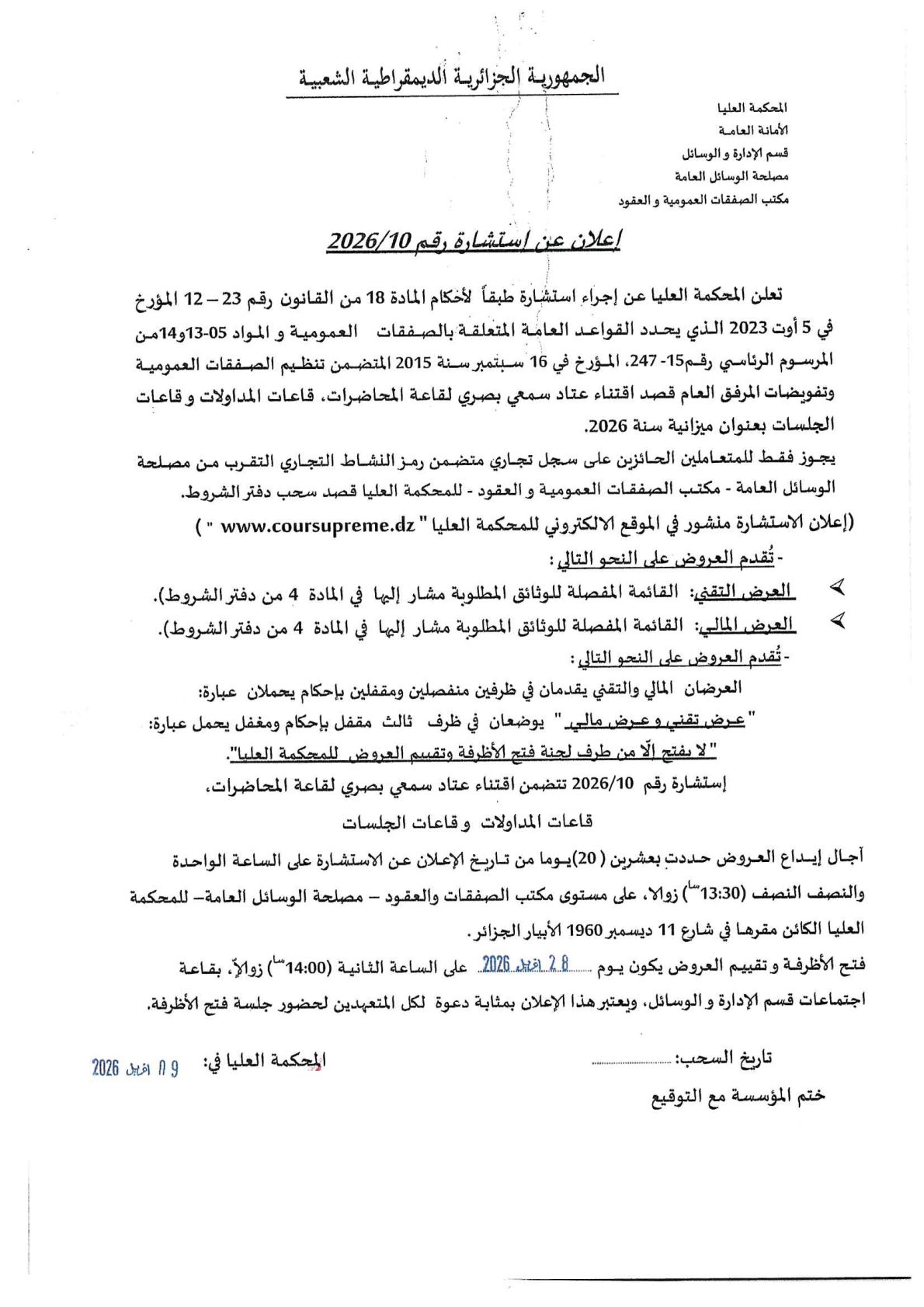تعلن المحكمة العليـا عن إجراء إستشارة رقم 2026/10 قصد اقتناء عتاد سمعي بصري لقاعة المحاضرات، قاعات المداولات و قاعات الجلسات
