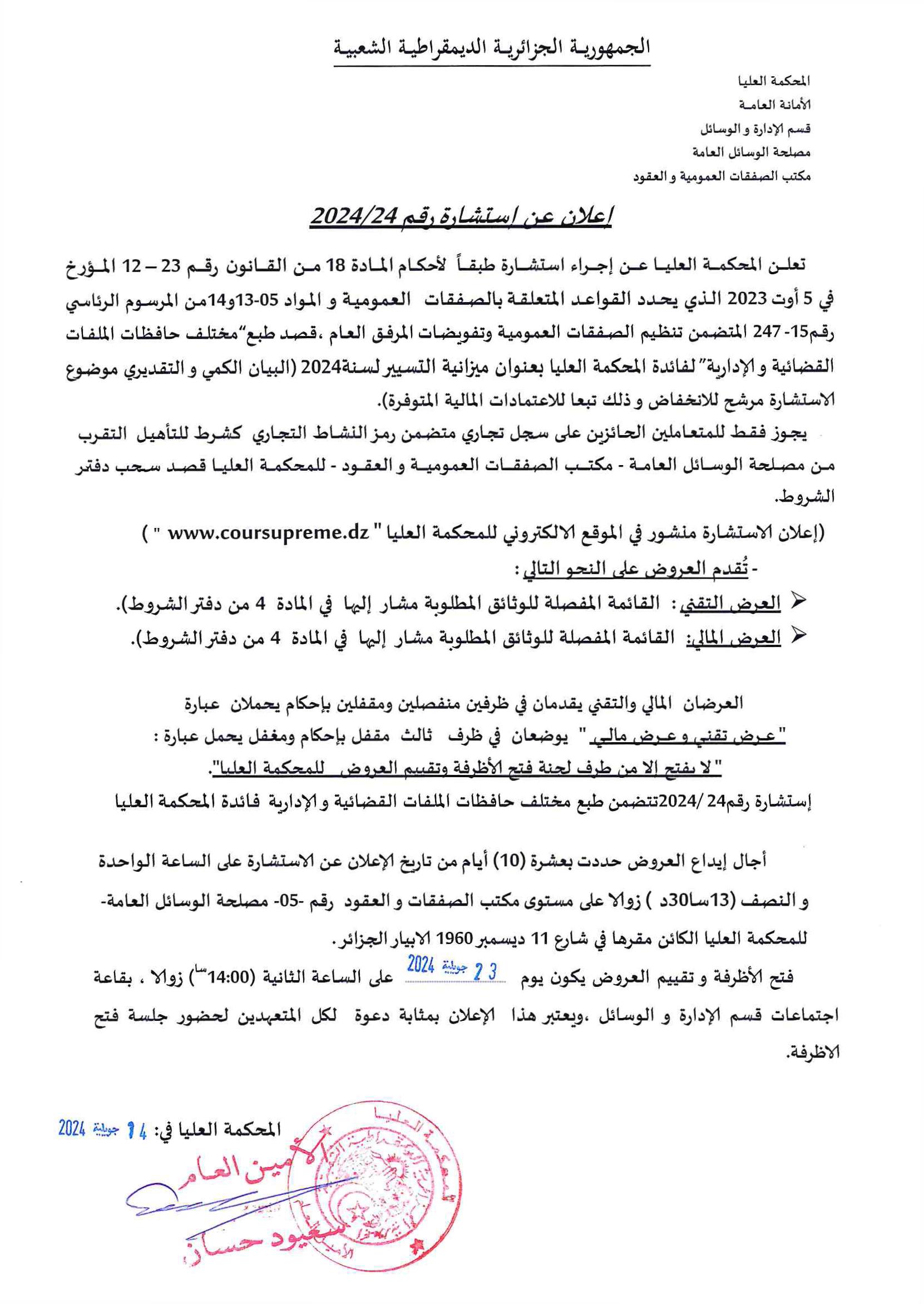 تعلن المحكمة العليـا عن إجراء إستشارة رقم 2024/24 قصد طبع “مختلف حافظات الملفات القضائية و الإدارية” لفائدة المحكمة العليا